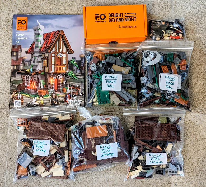 Les pièces sont réparties en plusieurs sachets triés par module (rez-de-chaussée, premier étage, deuxième étage, personnages, etc.), tandis que le système lumineux est rangé séparément dans son propre sachet. Retour dans les mêmes conditions.