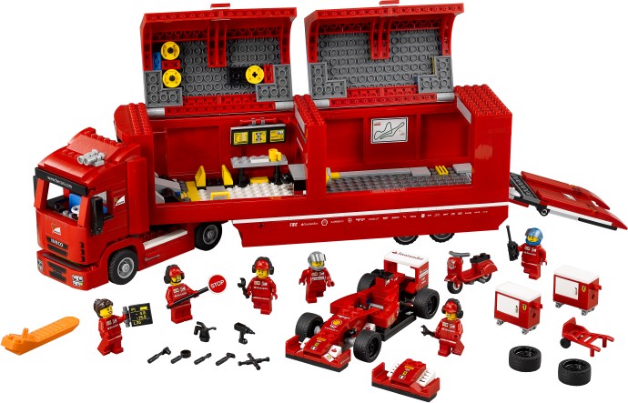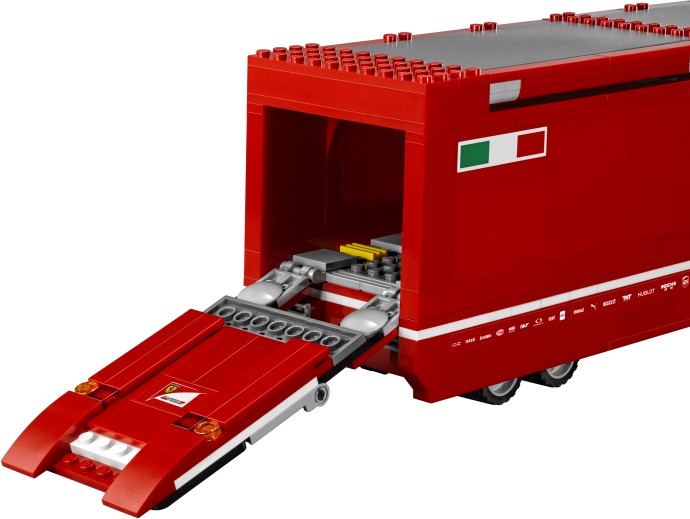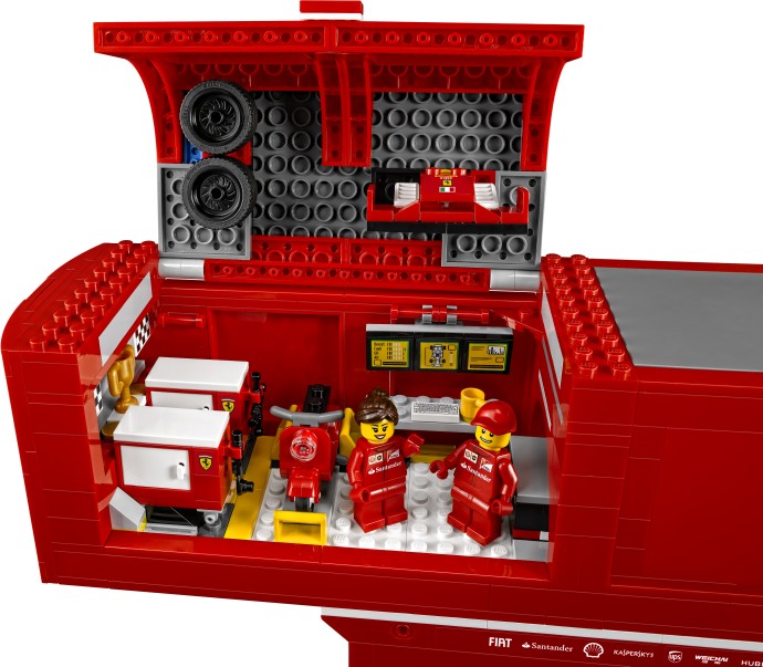 - Scuderia Ferrari Truck features driver’s cabin with opening roof and 2 seats for minifigures, detachable trailer with opening roof and sides for easy play, lever-operated standing feet and retractable rear hatch/ramp, F1 car launch function, scooter, complete tool set (including a power drill, oil can, screwdriver, wrench, hammer, cross wrench, closed wrench, open wrench and a socket wrench), computer screens, 2 tool chests, trophy, coffee mug and storage space for all accessories
