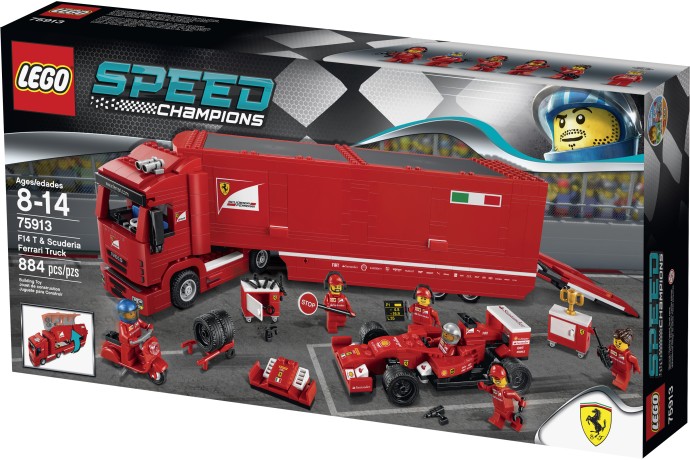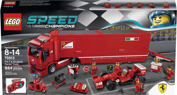 Drive the Scuderia Ferrari team and F14 T race car to the circuit in the fully-equipped Scuderia Ferrari truck. Open up the roof of the cabin to place the truck driver at the steering wheel with a team crew member alongside. Detach the trailer and turn the lever to release the standing feet. Fold out the roof and sides to access the awesome race car, scooter and array of cool equipment including a complete tool set and computer screens. Lower the rear hatch and activate the launch function to push the F14 T down the ramp. Then challenge your friends and their LEGO® Speed Champions cars to thrilling races! Includes 6 minifigures with assorted accessories: a driver, team truck driver and 4 team crew members.
