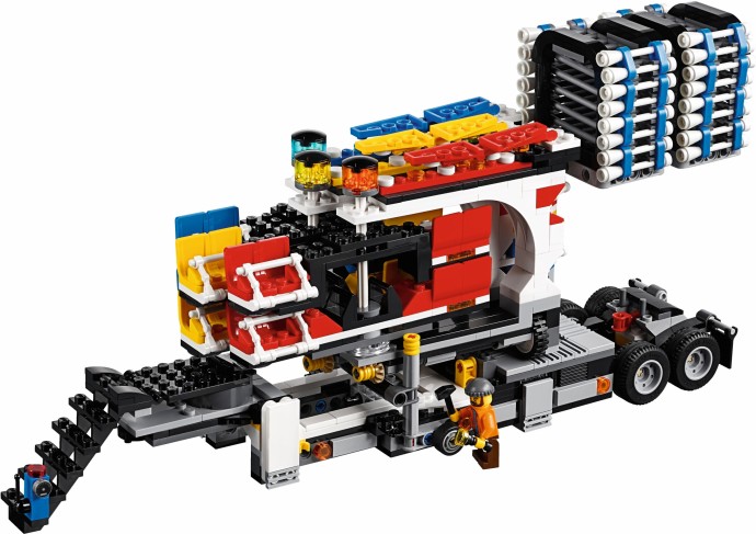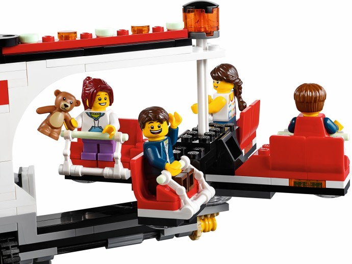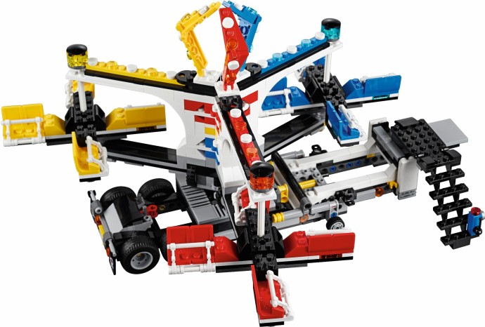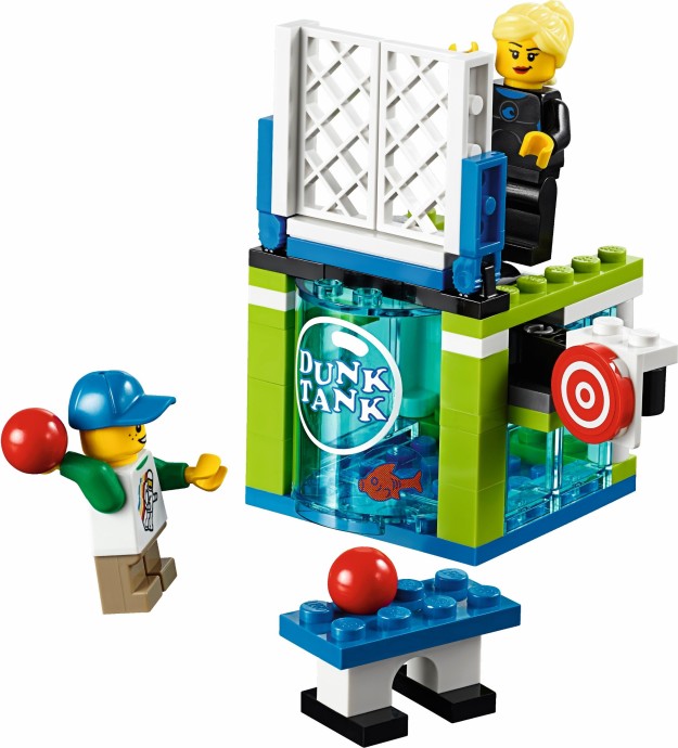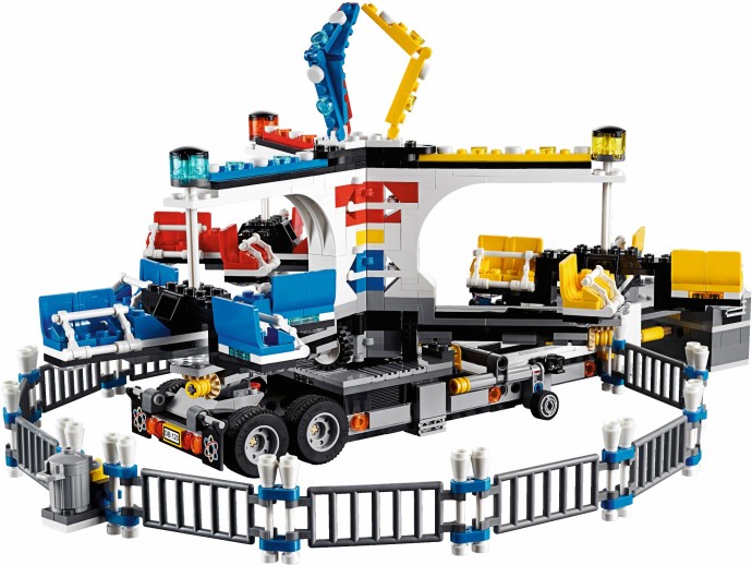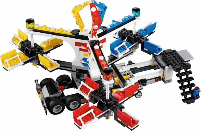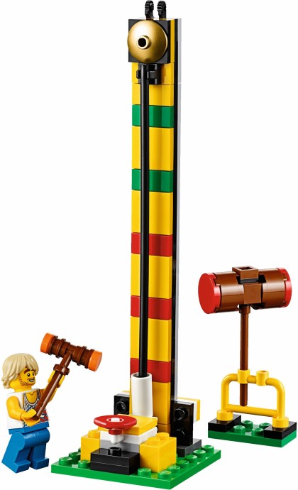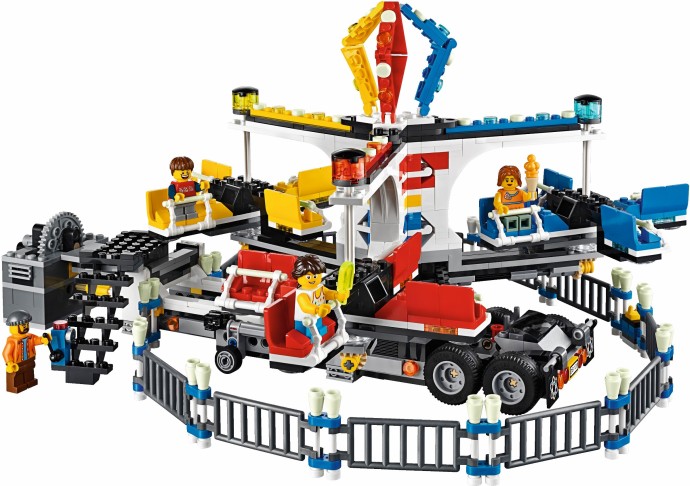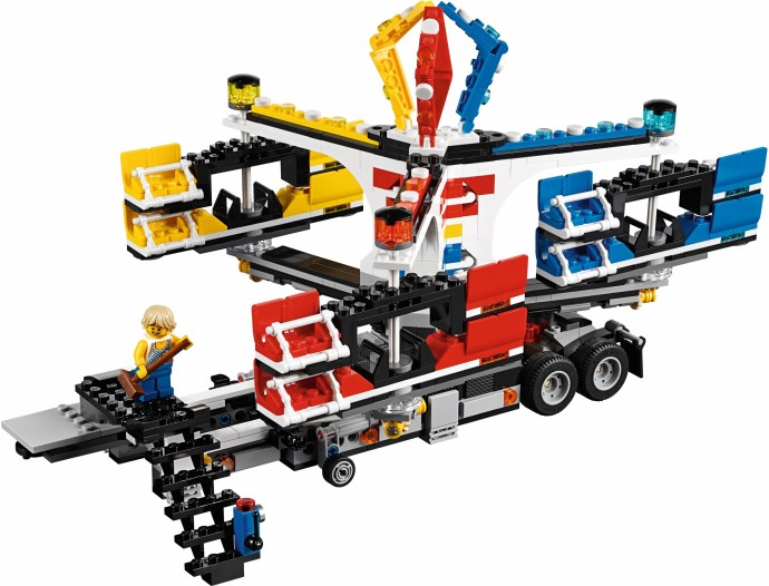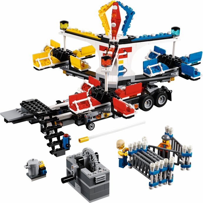 Unfold the awesome Fairground Mixer, turn the crank and see it come to life! The fair has come to town and children and adults alike can’t wait to try the rides. Buy your ticket from the ticket booth and climb aboard the Mixer. Then try reaching the golden bell on the high striker or hit the target to plunge the dunk tank lady into the water. As evening falls, the swirling Mixer ride glows in the darkness, before being folded down onto its own trailer for transportation to the next town. This magical fairground is packed with wonderful details that will capture everyone’s imagination. Includes 12 minifigures: a juggling man on stilts, dunk tank lady, strong man challenger, ticket lady, truck driver/ride operator, 2 women, 2 girls, 2 boys and a queasy man who tried the mixer one too many times.