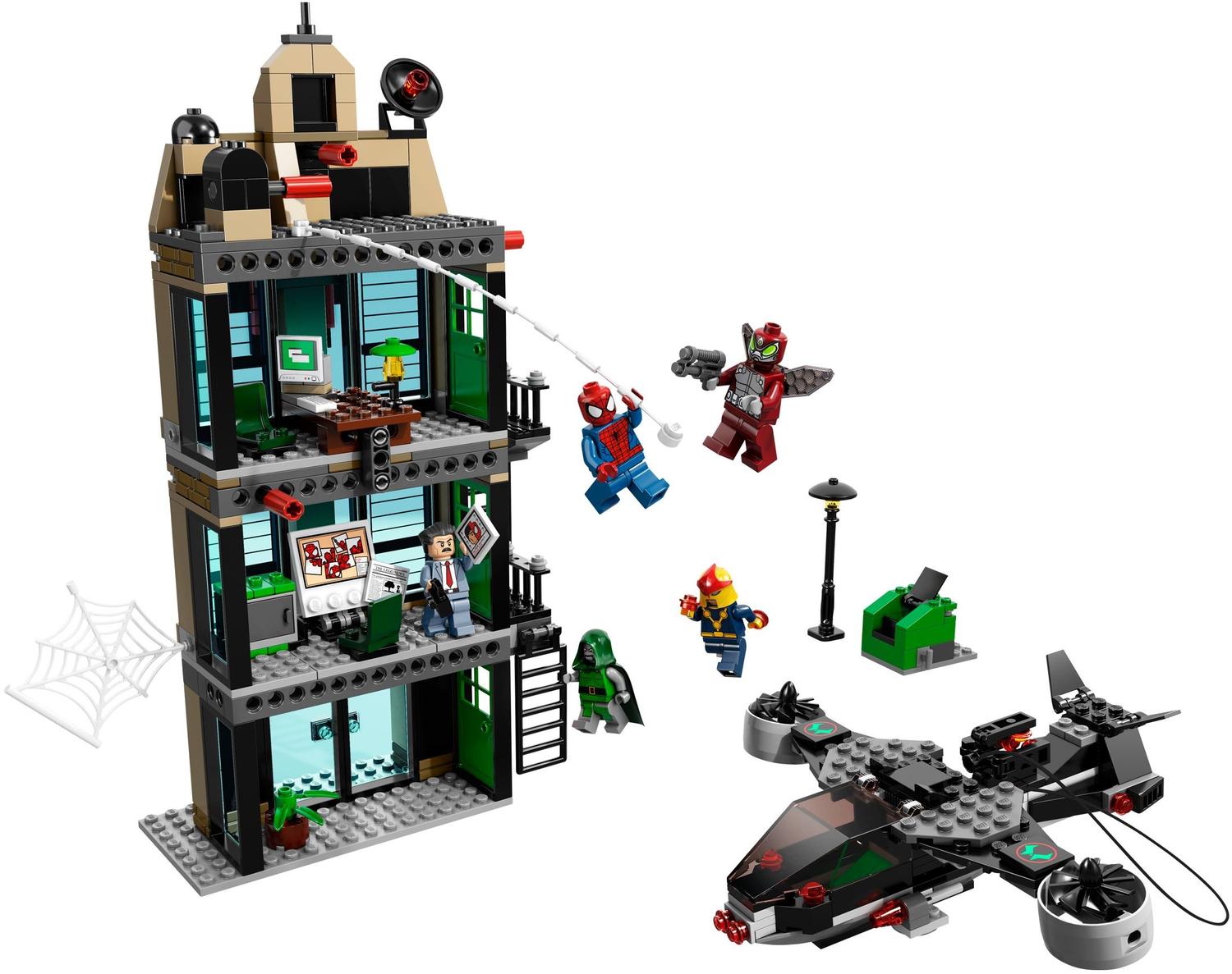 Dr. Doom™ and his henchman Beetle™ are attacking the Daily Bugle in their speedy jet to steal Spider-Man's™ secret identity. It's up to Spider-Man™ and Nova™ to swing in and stop them! Trigger the Daily Bugle's explosion functions to cause destruction as the jet fires missiles! Stop Dr. Doom™ from hitching the jet's anchor hook to the safe with Spider-Man's secret inside! Knock Beetle™ off the building with the swinging web attack and drop Dr. Doom™ inside with the rooftop trapdoor! Then fly Nova™ in through the broken window with the dumpster catapult function and send those villains back to where they came from. Includes Spider-Man™, Nova™, Dr. Doom™, Beetle™ and J. Jonah Jameson™ with accessories and weapons.