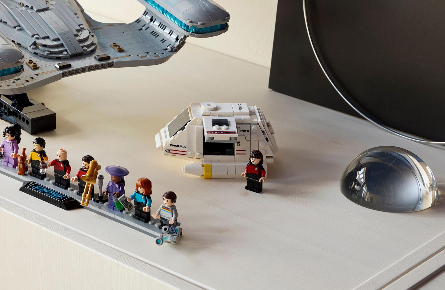 Includes 9 minifigures with themed accessories and a minifigure-display tile with Star Trek: The Next Generation branding. Characters include Captain Jean-Luc Picard, Commander William Riker, Lieutenant Worf, Lieutenant Commander Data, Dr. Beverly Crusher, Lieutenant Commander La Forge, Counselor Deanna Troi, Bartender Guinan and Wesley Crusher. Accessories include a teacup, trombone with a stand, a phaser, tricorder, engineering case, PADD, bottle, portable tractor beam generator and a cat figure.