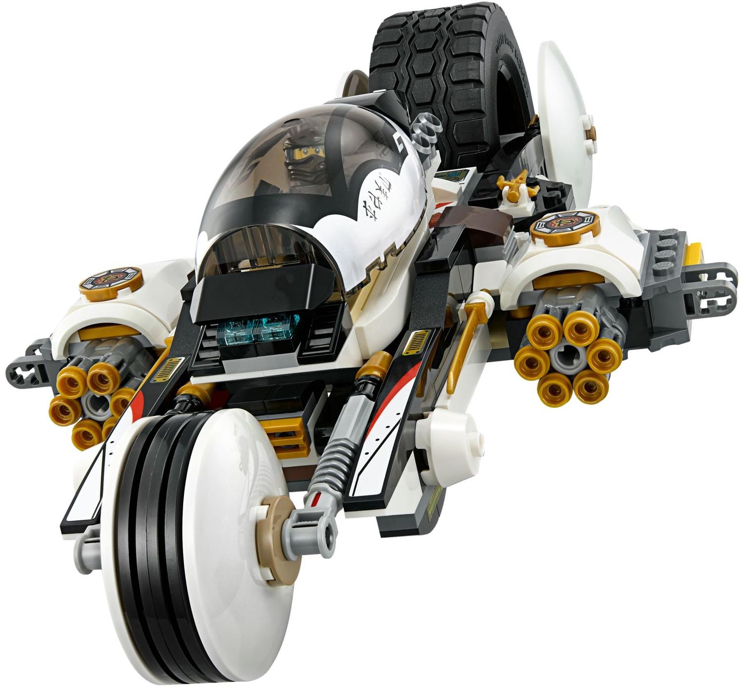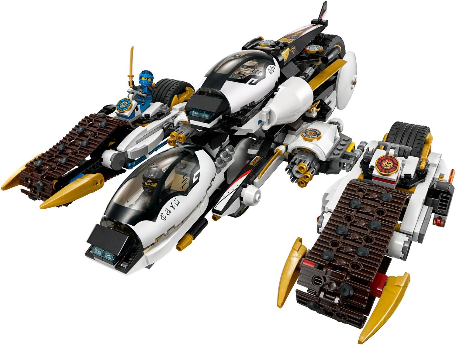 The Super Sonic Raider has been reinvented to become the Ultra Stealth Raider and is ready to take on Master Yang, Master Chen and Eyezorai. Jump into the cockpits with the ninja heroes and speed into battle. Swerve the snapping jaw and spring-loaded shooters of the Chenosaurus. Fire back with the awesome tank's twin 6-stud rapid shooters and 2 spring-loaded shooters, then split it into a helijet, a huge bike and 2 tread bikes to ambush the enemy. Detach the golden ninja weapons for one-on-one battles and grab Master Yang's Aeroblade to claim victory!